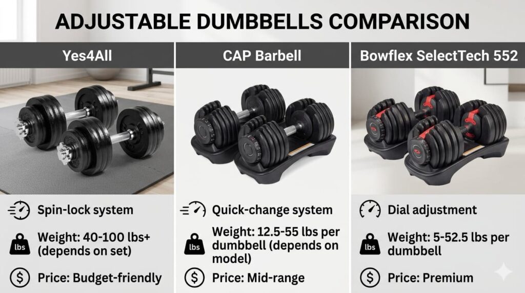 | Yes4All Adjustable Dumbbells | Budget strength training | 40–100 lbs | Spin-lock | Best value | View on Amazon |