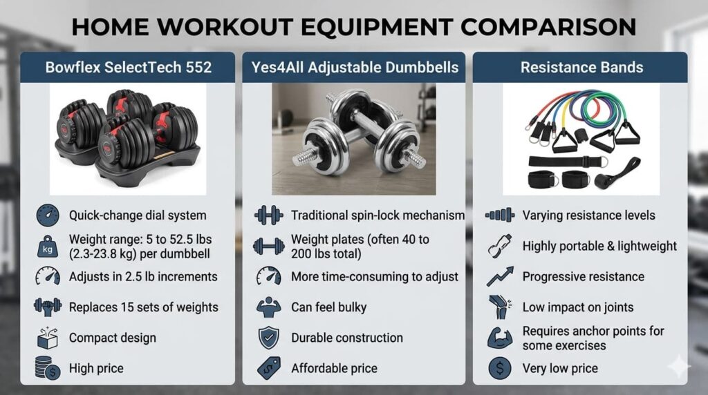 Bowflex SelectTech 552 vs Yes4All Adjustable Dumbbells vs Resistance Bands